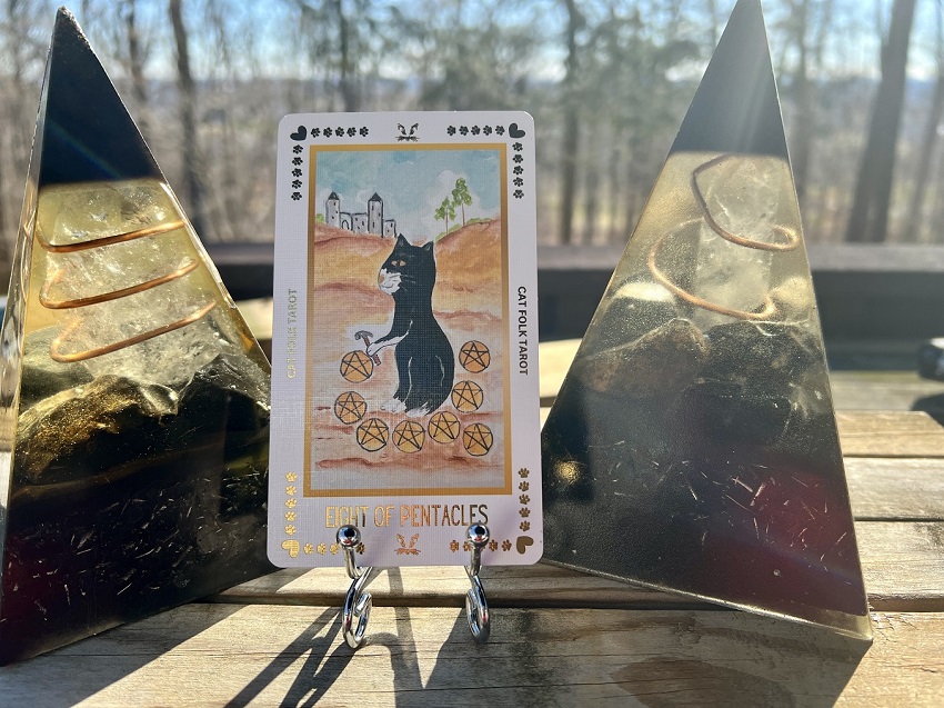 Reversed or with challenging cards around the Eight of Pentacles could indicate that you are working too hard, with workaholic tendencies. Putting your time and energy into wrong areas or that you lack the confidence to invest in your natural skills, talents or being too insular, failing to pass on your knowledge to those following in your footsteps. Fear of being overtaken.