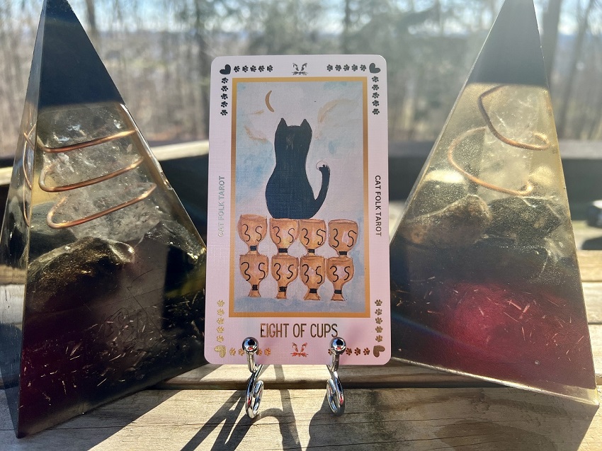 The Eight of Cups symbolizes the act of walking away or giving up on something for various reasons. It suggests observing events unfold without interfering to manipulate outcomes, potentially leading to reduced stress by relieving the pressure to make a decision. This surrender could be a personal choice or prompted by circumstances that indicate reaching the limit of possibilities. Alternatively, it may signify leaving behind something that is already finished or finding the motivation for one last attempt at completion. Exhausting all options or gathering resources for a final, bold effort to achieve something are also possible interpretations. Consequently, this card now signifies completion. It's time to give up, the Eight of Cups is telling you it’s time to walk away. So, let's pick up our paws and head in a new direction. This has run its course. Something better lies ahead.