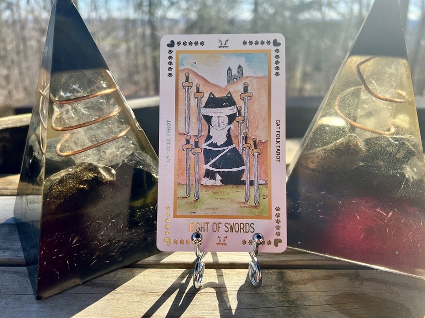 When the weight of dealing with a situation, or handling anything mentally demanding becomes overwhelming, it is often easier to ignore it. The Eight of Swords symbolizes the inclination to cover our eyes or avoid facing an unpleasant choice. The card shows a fully restrained cat, symbolizing the confinement of its thoughts. These restraints serve as a physical representation of its imprisoned mind. Despite being seemingly trapped, the bindings are easily breakable, signifying that these limitations can be effortlessly surpassed with the proper mindset. This card frequently indicates worry, brought on by the fear of making a wrong decision, upsetting someone's feelings, or taking responsibility for our actions. It also highlights the victim mentality that can exacerbate the problem. The individual feels burdened, hopeless, and powerless, often facing limitations beyond their control. However, this is only a temporary state and not a permanent circumstance. Sometimes our anxiety about making a choice is worse than the actual outcome of the situation itself. Consequently, in an attempt to evade something that will eventually need addressing, we find ourselves paralyzed instead of making an intentional decision.