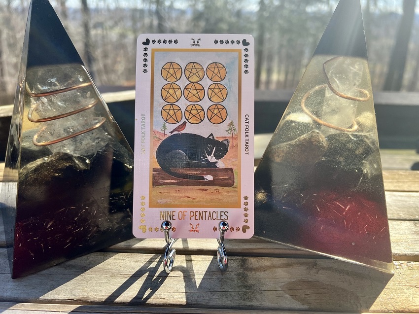 Reversed or with challenging cards around the Nine of Pentacles could indicate that there is one more challenge to overcome and that you haven’t yet reached the point where it is smooth sailing. Or it could be that you have reached that point but you are failing to stop and appreciate this.
