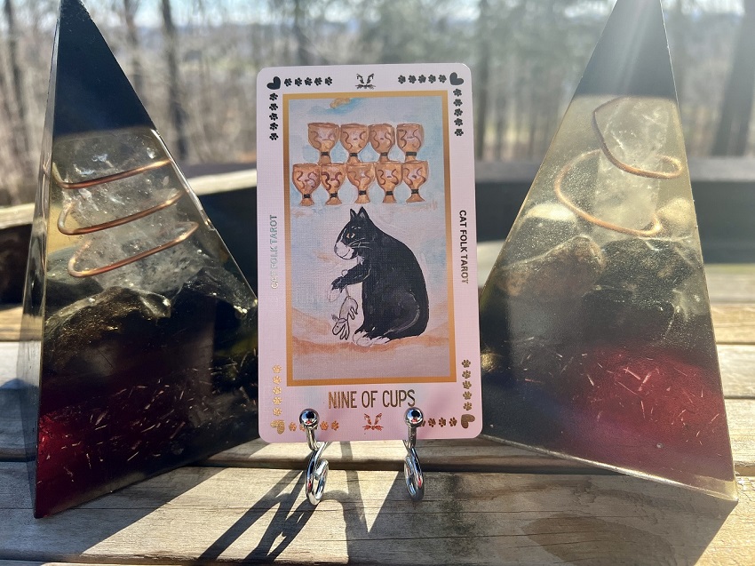 Reversed or with challenging cards around the Nine of Cups, this could indicate being smug or boastful or on the other end of the scale, lacking the confidence to appreciate what you have accomplished or gifts you have to be grateful for. While this is ultimately a positive card, the downside would be anything that is blocking you from feeling a sense of accomplishment.