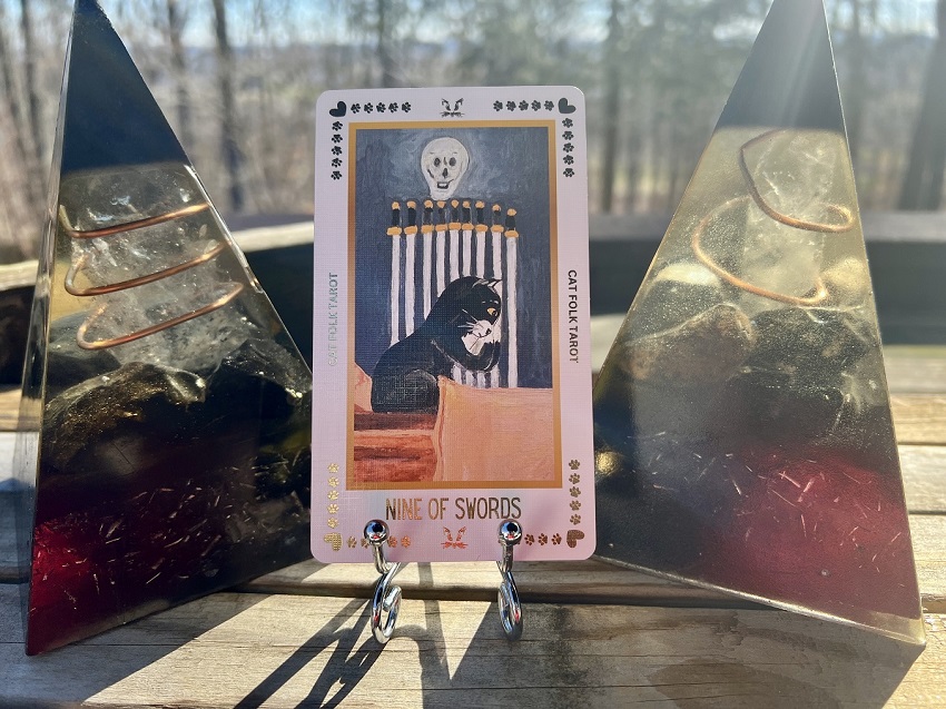 Reversed or with challenging cards around the Nine of Swords can represent a surrendering to this process, a letting go and finding alternative ways to soothe the mind. This can indicate a time to take up meditation, spirituality or an escape into fantasy through books, movies or TV programmes. This is a healthy escape because the stress indicated by the Nine of Swords can impact your health.