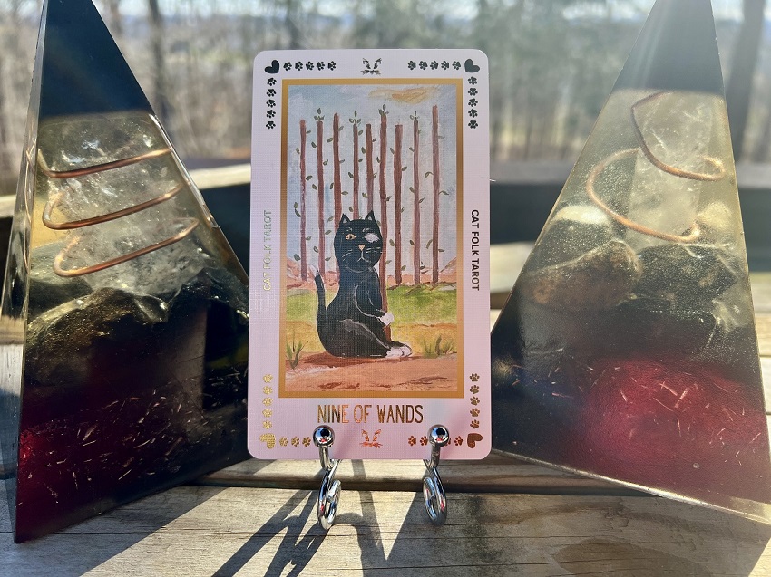 Reversed or with challenging cards around the Nine of wands, could indicate a lack of being able to find that inner strength and resilience to make that final push or there could be barriers. You might be putting in the effort but you are not getting the rewards or you can’t see the point. If the way forward is blocked retreat and consider whether you might be going about it the wrong way.