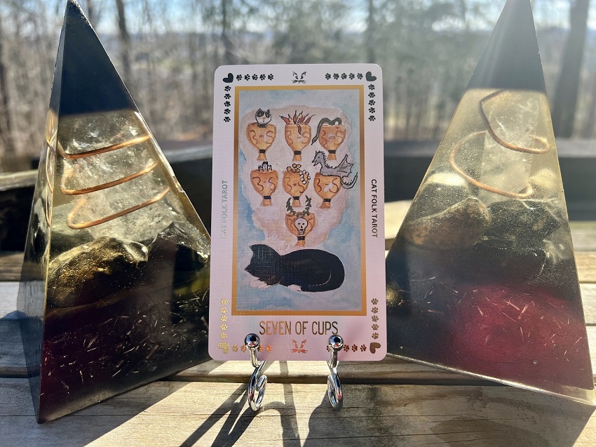 Reversed or with challenging cards around the Seven of Cups, this could indicate that we are failing to see the advantages or that by having a choice means that we have options. The negative implications here could be feeling paralysed by indecision or thinking that we have no options.