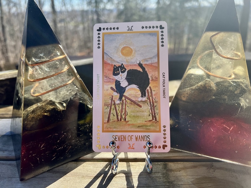 Reversed or with challenging cards around the Seven of Wands, could be a literal reversal of its upright meaning in that challenges don’t materialise, help is at hand and things naturally fall into place. It also could mean that the challenges are more extreme but there is still a need to find your inner strength.