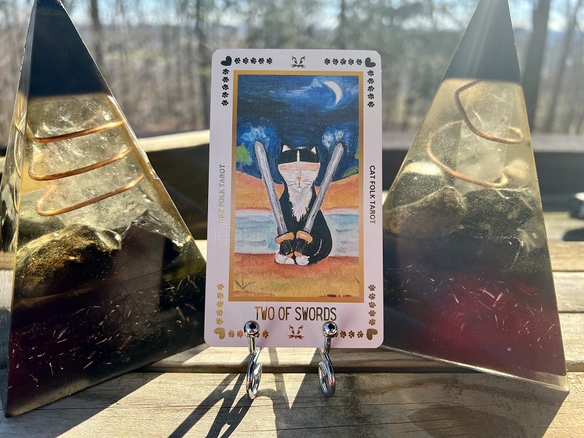 The Swords numbered cards possess a more ominous aura compared to the other suits due to their association with mental processes. Regardless of the suit, the number two symbolizes the convergence of two elements; however, when this occurs within the mind, it can breed uncertainty. This represents the need to choose between two possibilities or feeling torn in opposing directions. It's a crossroads where difficult decisions must be made. We see in the card that the cat is blindfolded, meaning he can neither see the problem nor the solution clearly. He wants to listen to his mind, not his heart. He is not able to see what he needs to see. In contrast to the Ace of Swords that signifies an influx of innovative ideas, the Two of Swords indicates a lack of clarity regarding subsequent actions. The unease conveyed by this card stems from feeling pulled apart or torn due to uncertainty about which path should be taken. Each course of action often carries consequences that result in emotional distress. Consequently, a compromise is frequently reached. Stepping back, meditating, or quieting the mind can assist in allowing the correct response to naturally emerge when faced with anxiety-inducing decisions.